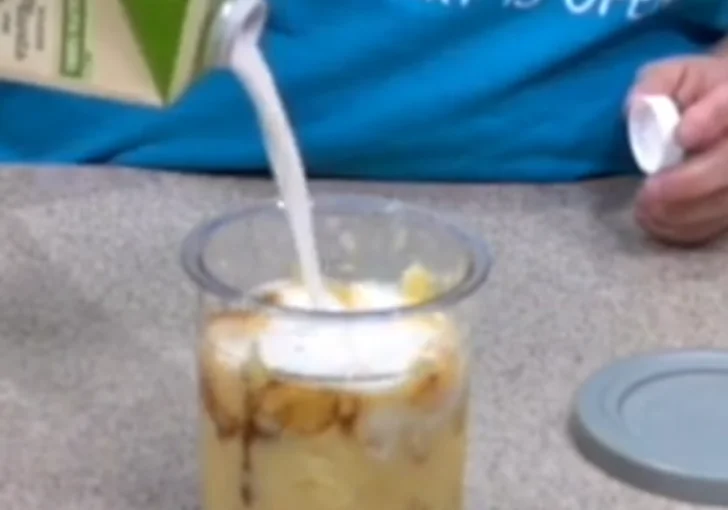 - Pour a small amount of unsweetened almond milk into the container. Stir the mixture gently with a spoon to combine the banana, vanilla, sweetener, and milk. Add only enough liquid to help it mix smoothly while staying below the Ninja Creami pint fill line.