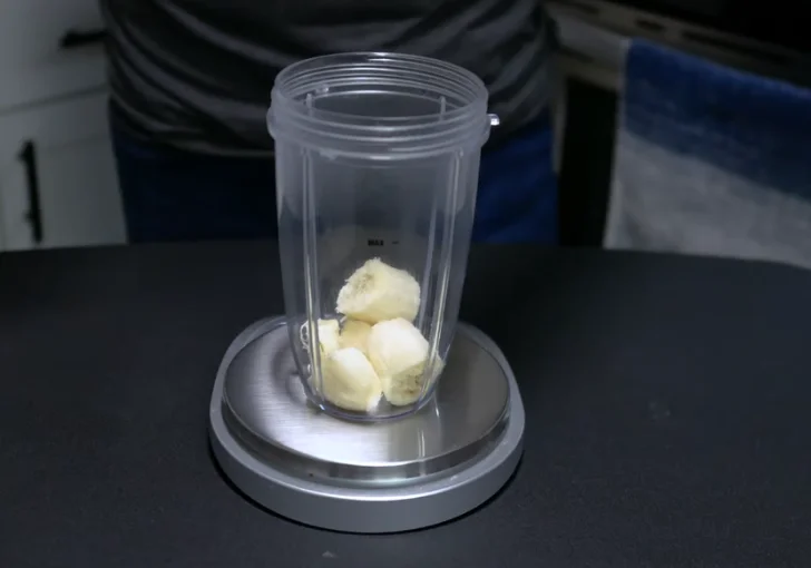 Place a blender cup on a kitchen scale and weigh out 70 grams of banana. Use a banana that is ripe with a few brown spots but still firm. Avoid overly soft or mushy bananas, as that can affect texture and flavor balance. Break the banana into chunks and add it to the blender cup.