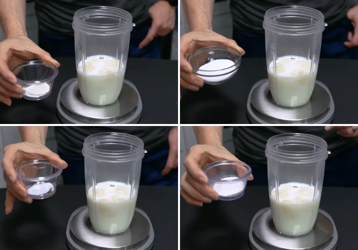 Add ¼ teaspoon xanthan gum to help thicken the mixture and create a creamy texture once frozen and spun. Add 2 tablespoons of zero-calorie sweetener for sweetness. Add a small pinch of salt (just under ⅛ teaspoon) to enhance flavor. Finally, add 8 grams of zero sugar banana cream pudding mix to give the strong banana pudding flavor.