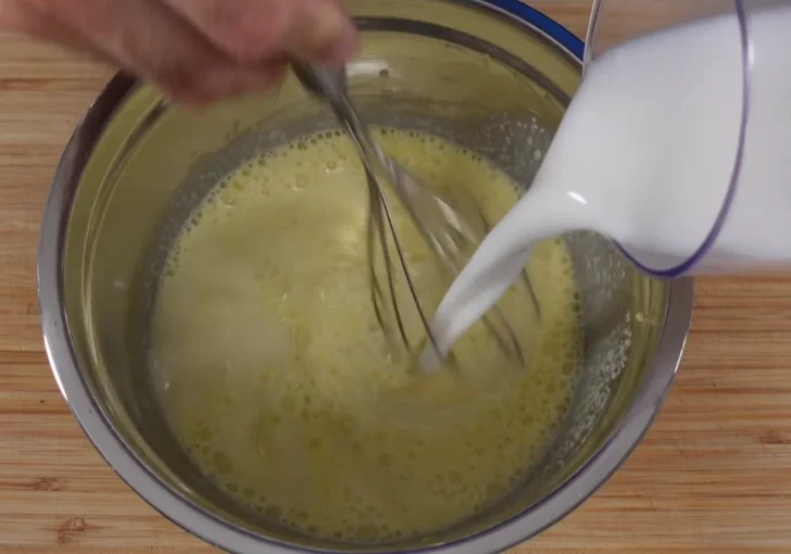 Pour the coconut milk into the bowl with the egg mixture. Stir well to combine everything. The sweetener may not dissolve completely at this stage, which is normal. Continue mixing for about a minute until the ingredients are evenly incorporated.