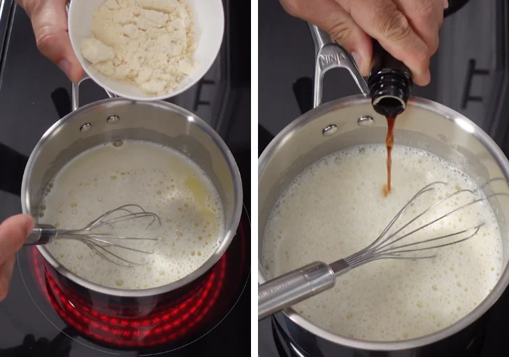 - Once the mixture reaches about 110°F (43°C), slowly add the vanilla whey protein powder. Sprinkle it in a little at a time while stirring continuously to prevent clumping. After the protein powder is fully incorporated, add the vanilla extract and rum extract and stir to combine.