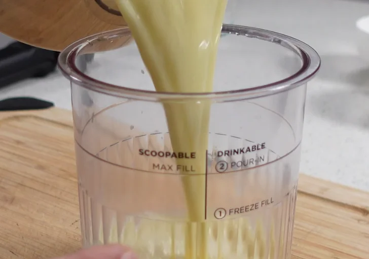 - Allow the mixture to cool slightly. Pour the ice cream base into a Ninja Creami pint container, making sure it does not go past the scoopable max fill line.