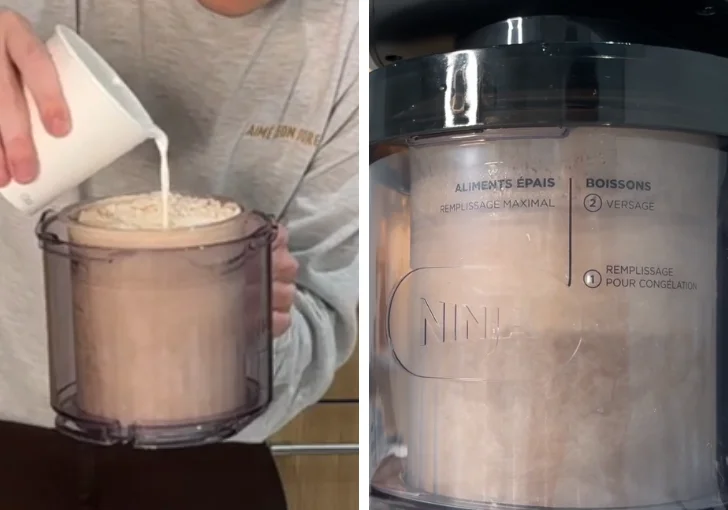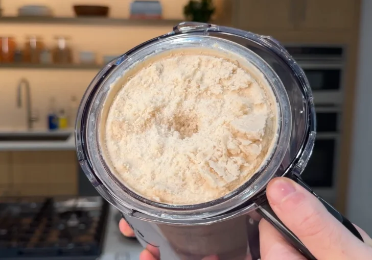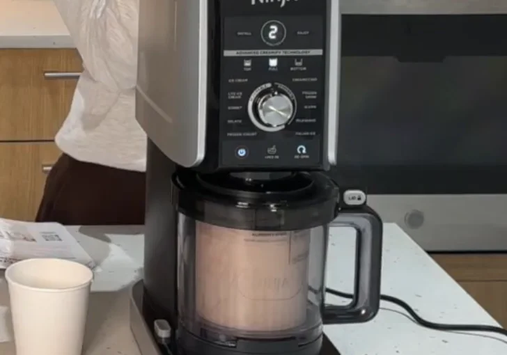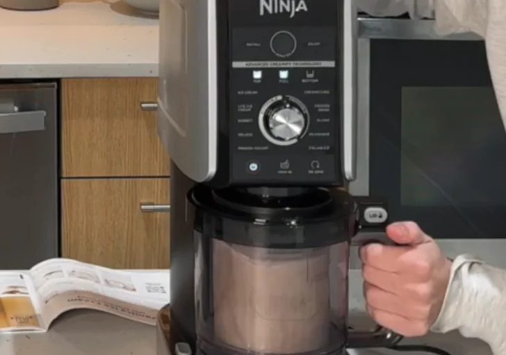 Select the “Ice Cream” function on the Ninja Creami and start the cycle. After the cycle finishes, remove the bowl and check the texture.