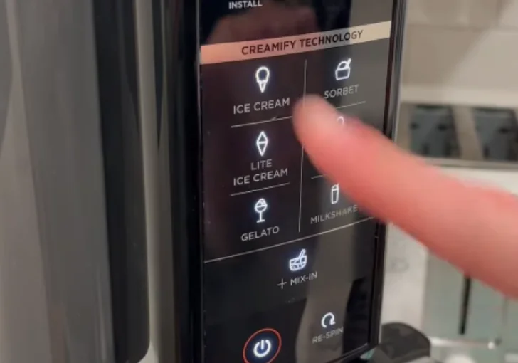 - After the first spin, check the texture. If it looks crumbly or powdery, use the Re-spin function. Repeat re-spinning as needed until the ice cream becomes smooth, creamy, and scoopable.