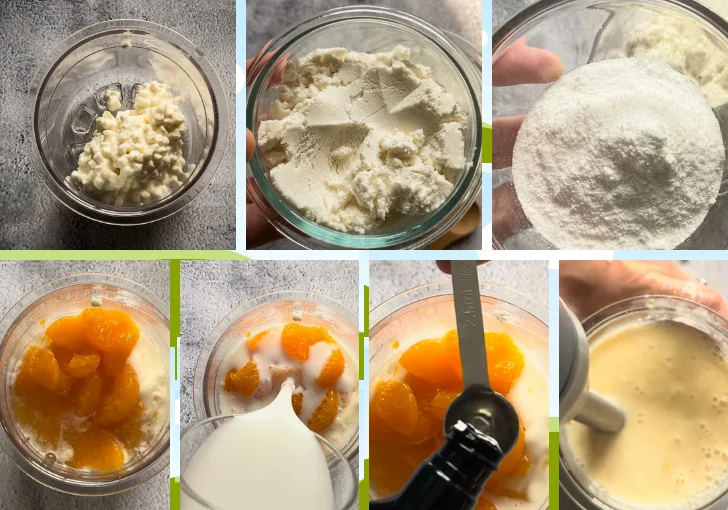 Add the mandarin oranges (with juice), cottage cheese, vanilla whey protein powder, low-calorie sweetener, orange extract, and unsweetened coconut milk into a mixing container. Blend everything using an immersion blender until the mixture becomes completely smooth and creamy with no visible lumps.