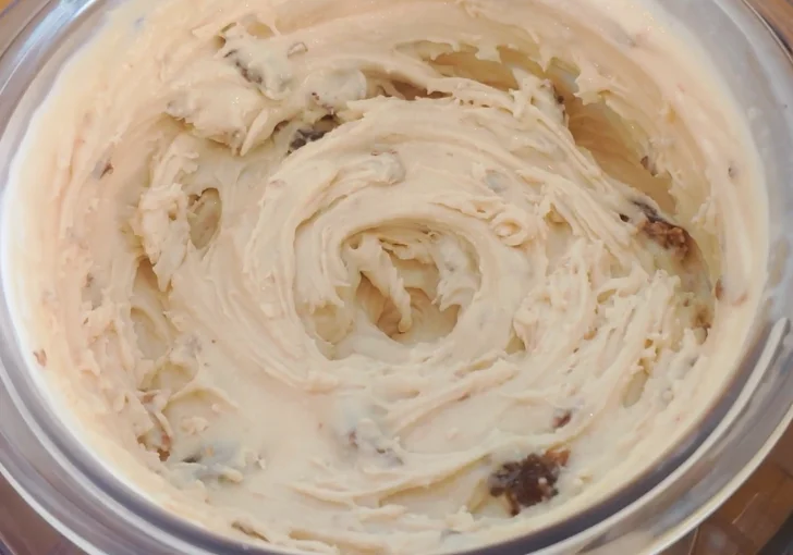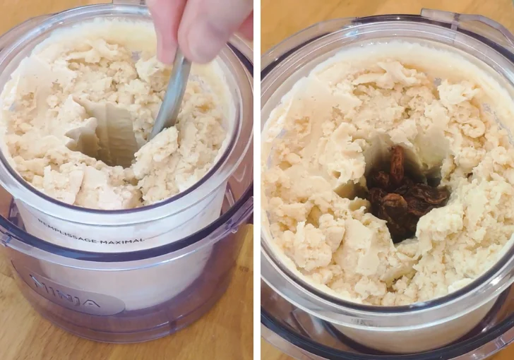 The Ninja Creami spins the frozen base into thick, smooth ice cream. Almost like gelato. When you use the mix-in setting, the raisins spread out evenly and stay whole.