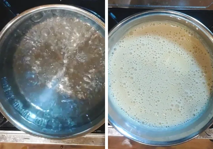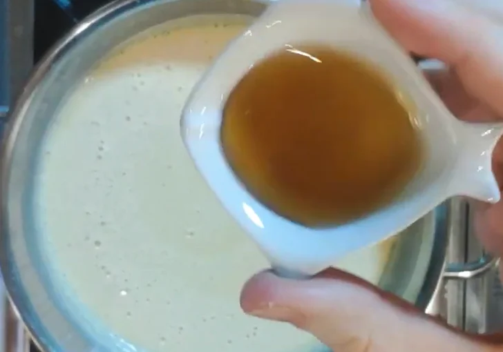 3. Heat a pot of water until it gently simmers. Place the bowl with the mixture on top of the pot to create a double boiler. Slowly heat the mixture while stirring until it reaches 75°C. The texture will remain slightly runny, which is correct. This step ensures the eggs are safely cooked without turning the mixture into a thick custard.