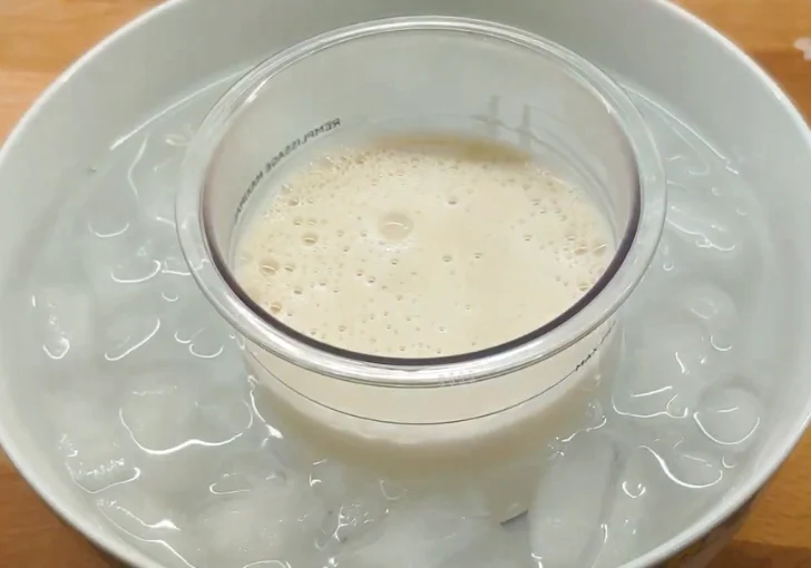 5. Pour the mixture into the Ninja Creami container. Place the container into an ice bath and let it cool down to room temperature. This step prevents ice crystals from forming too aggressively later.